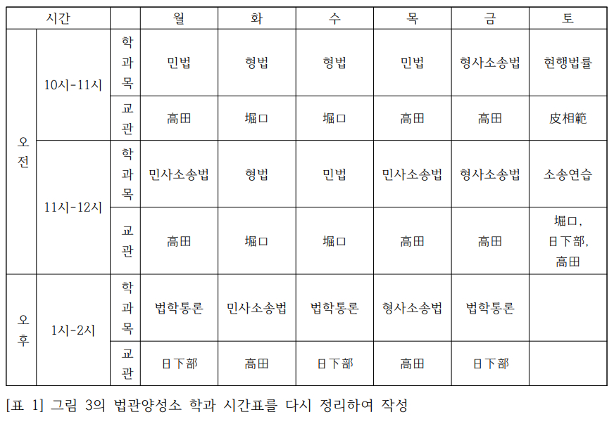 초기 법관양성소에서 운영하였던 학과목 시간표는 다음과 같다.