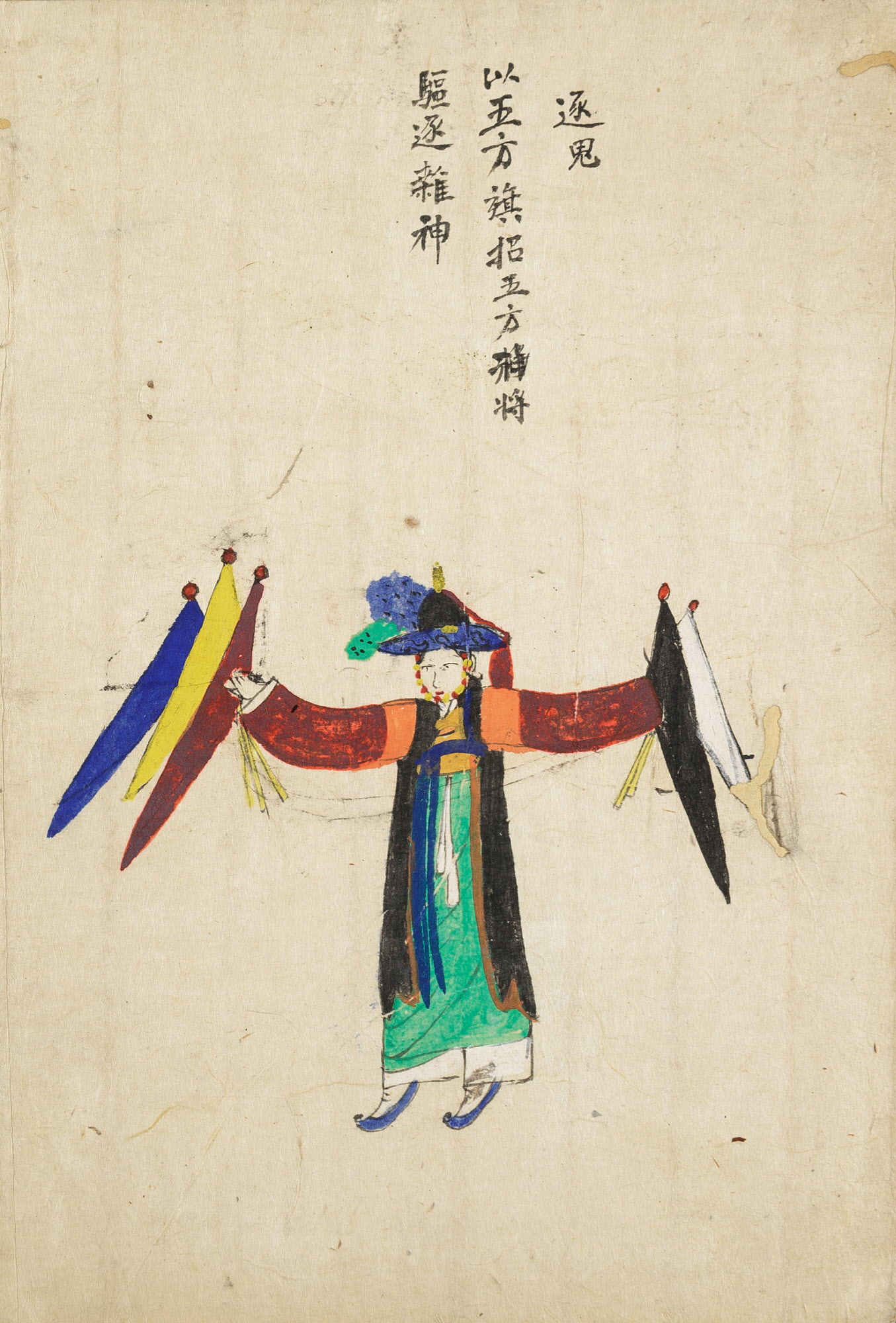 그림 6 가람본 축귀 그림 7 최길성, 『 한국의 무당 』 ⑶ 거리의 순서가 다르다. 고도서본은 ‘감응청배→제석거리→별성거리→대거리→호구거리→조상거리 →만신말명→(이름없음)→창부거리→성조거리→구릉→뒷젼’의 순인데 비해, 가람본은 「부정거 리」 다음에 ‘제석거리→대거리→호구거리→별성거리→감응청배→조상거리→만신말명→구릉거리 →?→창부거리→축귀→뒷젼’의 순으로 이어진다. ⑷ 가람본의 ?라 표시한 장면에 대해서는 약간의 설명이 필요하다. 이 면은 별지에 해설 없이 그림만 그려 「창부거리」 면 위에 붙인 것인데, 그림은 얹은머리에 색동소매의 원삼을 입고 손에는 방울 과 부채를 든 무녀가 굿상 앞에서 춤추는 장면이다. 이 그림을 흔히 「성조거리」라 하는데, 그것은 그림 오른쪽 하단에 ‘성조거리’, ‘고1430 18 see’라는 펜글씨 때문이다. ‘고1430 18’이란 고도서본 의 청구기호이다. 그러므로 이것은 이 그림은 「성조거리」인데, 고도서본을 참고하라는 의미로 풀 이할 수 있다. 다시 말해 고도서본과 대비했을 때 가람본에만 없는 것이 「성조거리」이므로, 이 그 림을 「성조거리」로 볼 수 있다는 것이다. 「성조거리」가 고도서본에는 있는데 가람본에만 없다는 것은 사실이다. 그러나 펜글씨라는 점, 그리고 ‘see라는 영어로 미루어 이것이 원저자의 글씨가 아 니고 후대에 누군가에 의해 추기된 것임은 확실하다. 뿐만 아니라 이 그림의 화풍은 가람본의 다 른 그림과 확연히 다르다. 따라서 이 면은 후대에 가람본에 추가한 것이며, 그림의 원작자가 「성조 거리」를 염두에 두고 그린 것이라 단정할 수도 없다.
