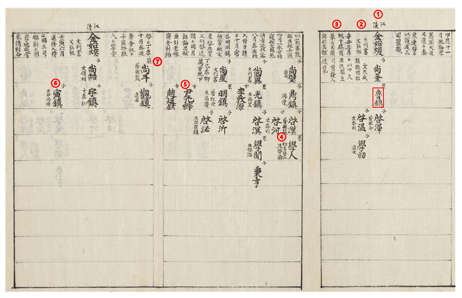 <사진 2>에서 『수혐록』 본문은 가로 10단으로 나뉘어 있다. 제1단에는 신임옥사 가해 측 관련자의 성명과 정보를 기록하고 제2단부터 제10단까지는 후손의 인적 사항을 기록하였는데, 단이 하나씩 내려갈수록 아들 대, 손자 대 등등 대수도 하나씩 추가되고 있다. 수록된 후손의 대수나 정보의 상세함은 인물 별로 각기 다르다.
