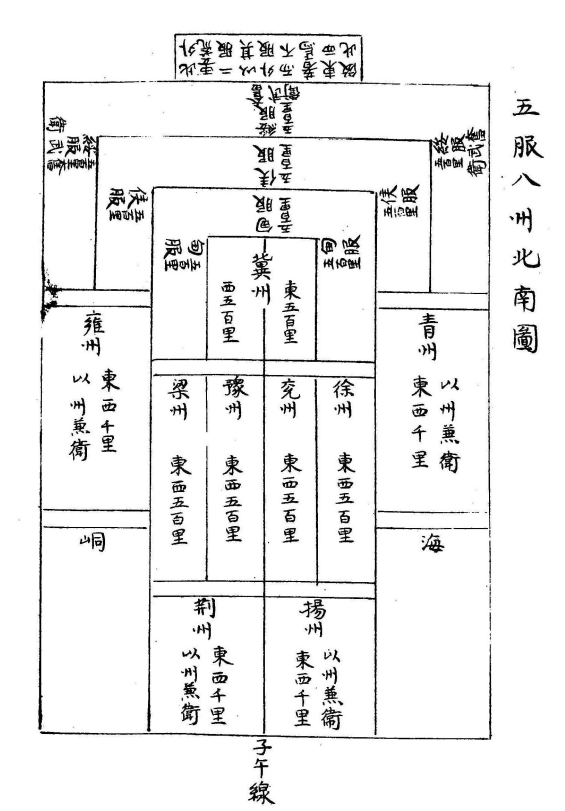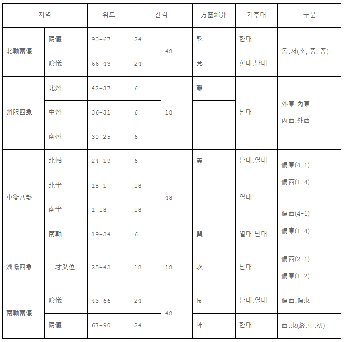 서명응은 『우공』의 지역 구획인 구주(九州)와 오복(五服)에 기초하여 세계 지역을 구분하였는데, 구획의 기준은 위도인 북극고도이다. 서명응은 먼저 「우공」의 구주에 일정한 북극고도의 값을 부여하되 그 상(象)을 역리(易理)로 해설했다. 기주(冀州)는 제왕의 도시이며, 천체에서 북극이 있는 곳에 사상(四象)이 향하듯이 천하의 공부(貢賦)와 사신이 몰려드는 중심지이자 「우공」의 강(綱)으로 파악했다. 따라서 기주의 상(象)은 바로 역(易)의 태극에 배치했다. 청주(靑州), 옹주(雍州)를 기주 하단에 좌우 대칭으로 배치하면서 역의 양의(兩儀)에 해당하는 것으로 보았고, 기주 바로 아래에 위치한 서주(徐州)·연주(兗州)·예주(豫州)·양주(梁州)는 역의 사상(四象), 서주·연주·예주·양주 아래에 있는 양주(楊州)·형주(荊州) 역시 역의 사상에 해당하는 것으로 보았다. 또한 「우공」의 오복은 동서와 남북의 크기가 모두 500리이며, 내복(內服)인 전복(甸服), 후복(侯服), 수복(綏服)과 만이(蠻夷)인 요복(要服), 황복(荒服)으로 구분되는 것으로 보았다.