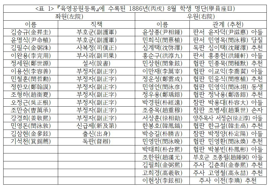 육영공원에서는 각각 좌원(左院)과 우원(右院)으로 나누어 학생을 선발하였다. 좌원에는 나이가 젊은 문무관리들을 특별히 선발하고, 우원에는 우수한 어린 학생을 선발하였다. 고종은 육영공원 설립 논의 당시, 각 아문의 당상관과 낭청(郎廳)의 친척들 중에서 학생을 추천하여 선발하도록 하교하였다. 『육영공원등록』에는 1886년 8월과 1887년 8월, 1889년 3월 선발된 학생들의 명단이 수록되어 있다. 그 중 육영공원 설립 초기인 1886년 8월 시점의 학생 명단은 다음과 같다.